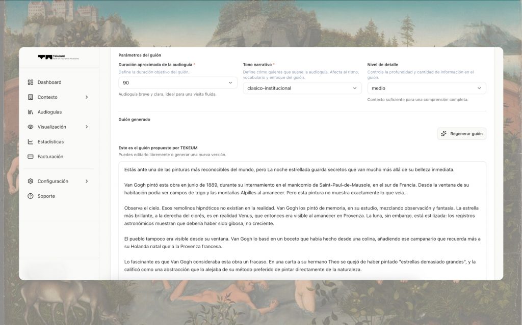 Subes fichas, cartelas y textos curatoriales. TEKEUM los analiza y genera la audioguía de principio a fin.
