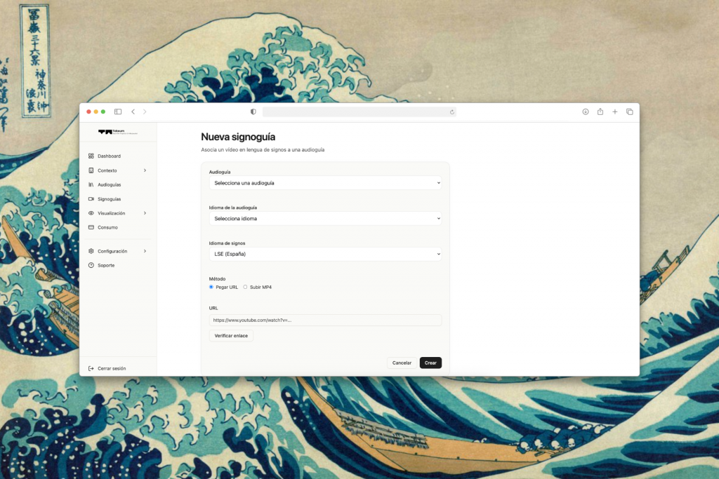 Sube el vídeo, indica el idioma de la lengua de signos y TEKEUM lo publica dentro del mismo recorrido: en la audioguía y en la web-app por QR.